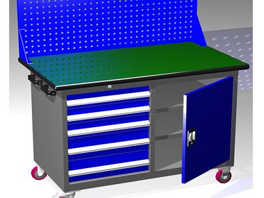 (2)五抽单开门移动工作桌,柜左边为564柜抽屉,配置为100mm*3,150mm*2,右边为单开门,门内一层可调隔板.